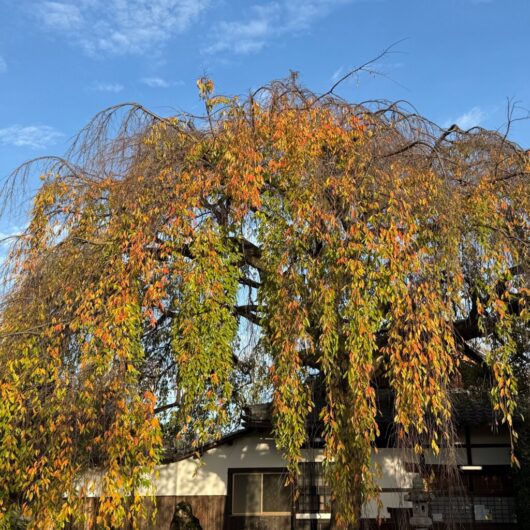赤く染まる🍁楓の紅葉は素晴らしいですが、秋風に揺れる桜の紅葉がそこはかとなく秋らしさを感じられるので素敵やと思ってます。こちらはお馴染み、本満寺さんの昨日の枝垂れ桜。今は紅葉の枝垂れ、秋の深まりを感じます。賀茂川堤、冷泉通りの桜も紅葉し、紫明通りの銀杏も黄色くなり始めてます。すっかり秋色に染まる京の都です。