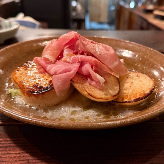 年頭、初「グリル猫町」さん。温かいカブのソテーの生ハム添え。総じてお野菜は生でも美味しいけどさっと火を入れると甘みが増すように思う。この小カブ、甘くて美味しいのは言うまでもなく柔らか過ぎず硬過ぎずの抜群の火入れ。上から掛けられたカブのピューレも美味しく生ハムの塩味と相性バッチリ👌。温かいのも嬉しい。さて、この日のやめときゃええのに、は柚子とチョコレートのタルト。ガハハハハ。悪魔や!悪魔。やっぱりこの日も悪魔が潜んでた!どれもこれも、いつもながら大満足の食事でした。😋😁