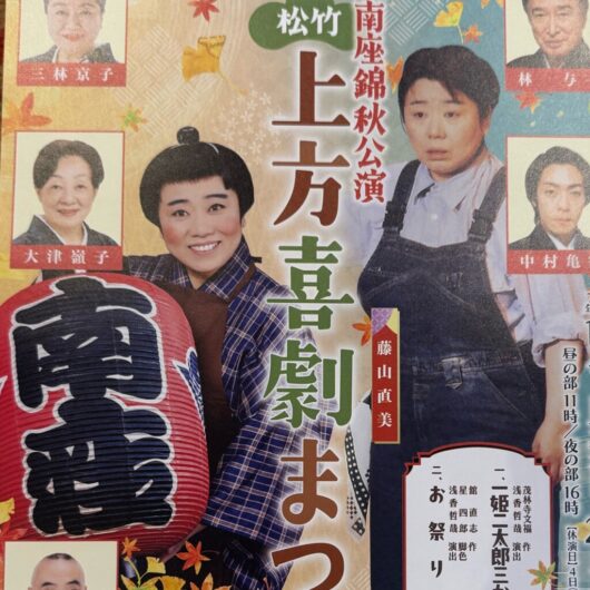 関西人乗りの笑いの中で育ったのでやっぱり吉本新喜劇、松竹新喜劇には思い入れがあります。吉本のボケとツッコミ、全員でズッコケるのも好きですが、どちらかと言うと笑いあり涙ありの人情もんの松竹新喜劇が好きでした。学校帰ったらすぐテレビつけて寛美さんの舞台かじりついて観てたもんです。花の六兵衛、大阪ぎらい物語などと並ぶ代表作、一姫二太郎三カボチャとお祭り提灯の2本でした。よう考えたらどれも直美さんの舞台で観てるやん。絶やさんでほしいもんです。笑い転げてみてた寛美さんと伴心平さんのアドリブの掛け合いはもう見れなくて寂しいけど、その代わりいま寛大師匠の生「ちょっと待ってね」が聞けたし満足、満足。😀楽しいお笑いの一日でした。さぁて、次の観劇は吉例顔見世興行になるんかなぁ。あーせわしなぁ。😅